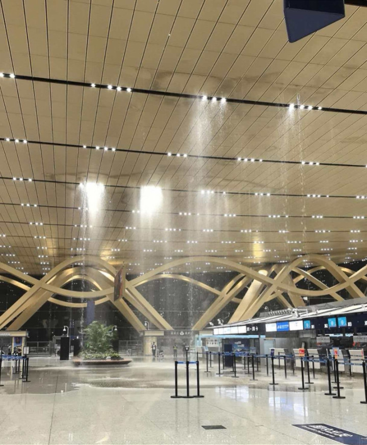 昆明长水机场航站楼顶部漏水画面。