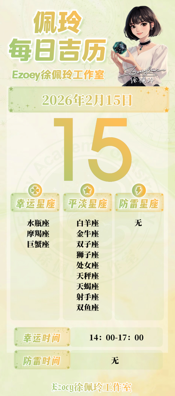 亚搏 【2.15日播报】东说念主脉加强日 运气星座: 水瓶座、摩羯座、巨蟹座——Ezoey徐佩玲26年星座播报♀️