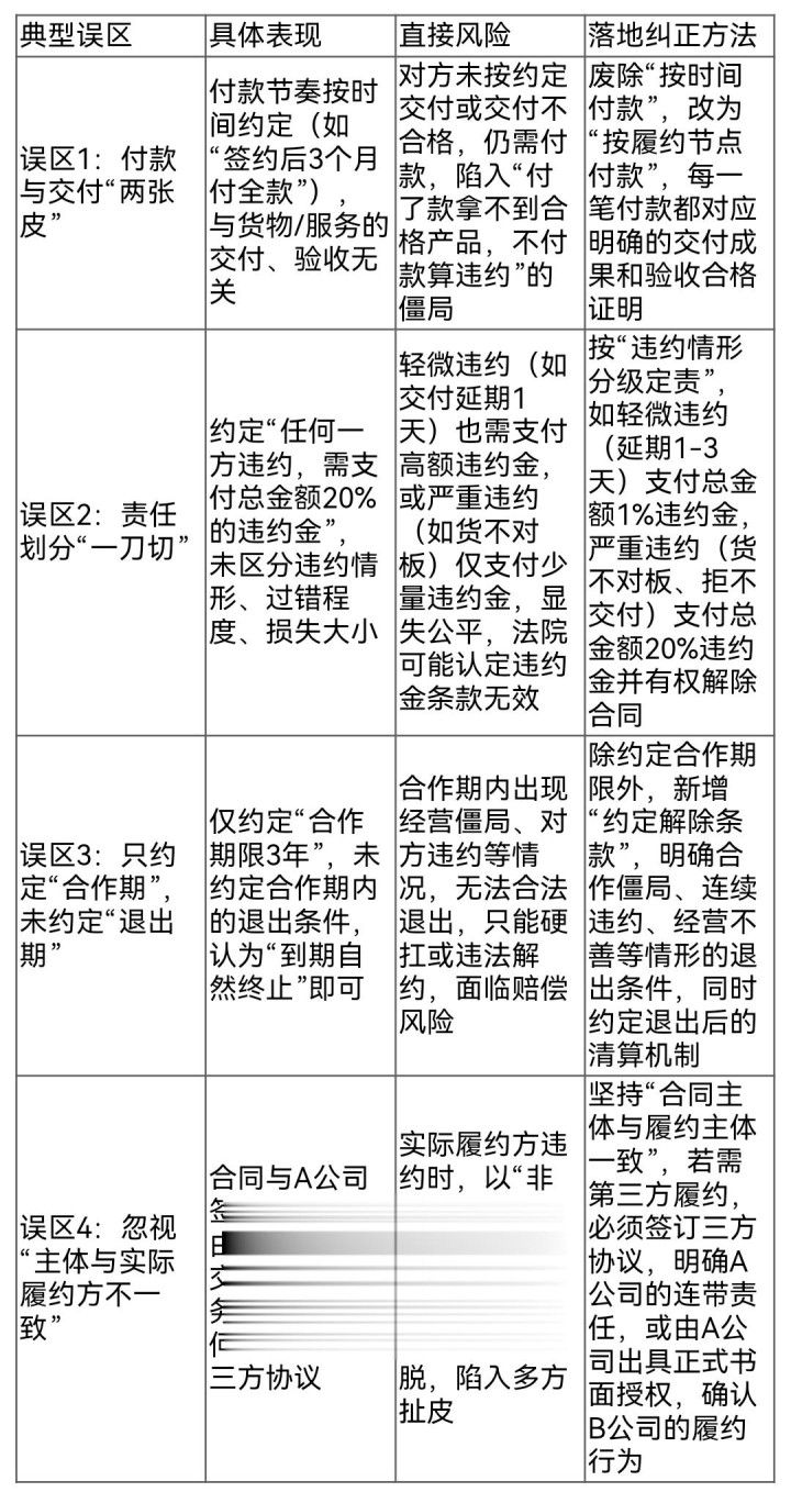 90%的企业合同风险,都源于交往结构的计议误区,而非要求翰墨问题。以下是最常见的4大误区,附具体修订要津,对照自查,快速避坑: