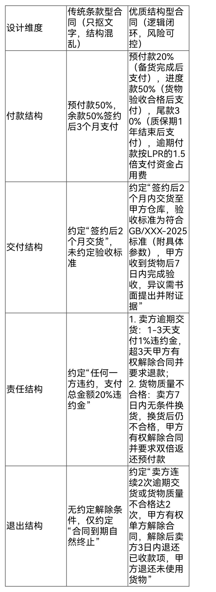 以100万货品买卖合同(新互助方)为例,勾通前文审查要点,计议一份风险可控、实施可落地的交往结构,对比传统要求型合同,一目了然: