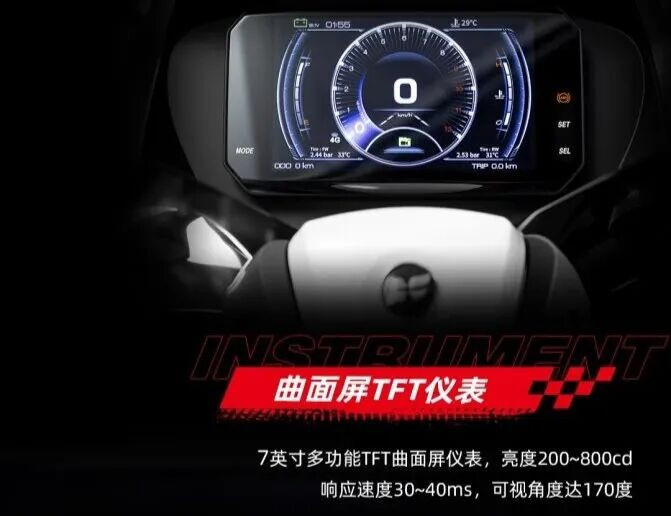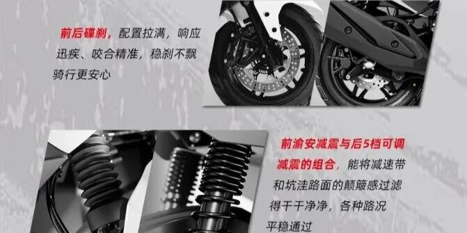 安全成立上,领有双翼梁结构车架、发动机防盗安设,配备胎压监测,双通谈ABS+TCS的组合、伏击制动灯、侧撑熄火、自动启停、驻车手刹、4挡可调的刹车牛角、前后碟刹+对向四活塞卡钳、渝安的减震等能思到的安全成立,基本都给配皆了。