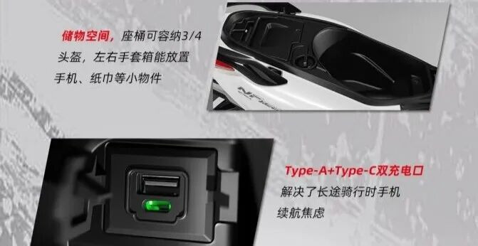 座桶空间因为大油箱的占用,不算异常大,但放下3/4盔没问题;傍边还有手套箱,能为止机、纸巾等小物件,里面配备USB + Type-C双充电口。