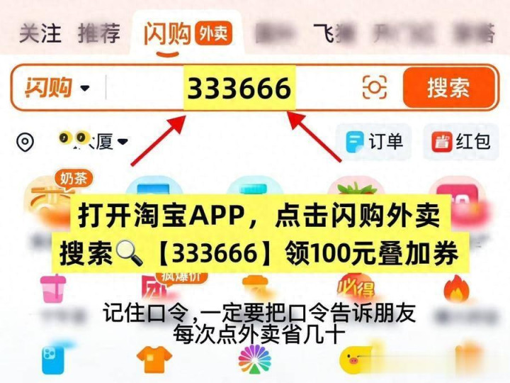 3. 淘宝闪购搜【333777】:新东谈主专属口令,针对初度使用淘宝闪购点外卖的用户,面额更高、抵制更少,首单优惠最明显。