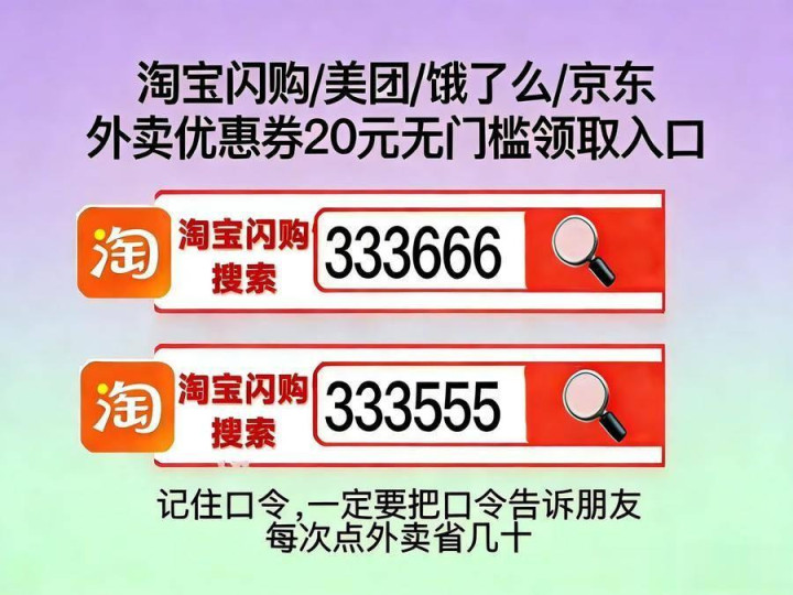 4. 长效福利进口:新东谈主福利收尾后,淘宝闪购搜【333666】【333777】等老用户外卖券口令,逐日仍可领券,抓续享受优惠,长期点餐更合算。